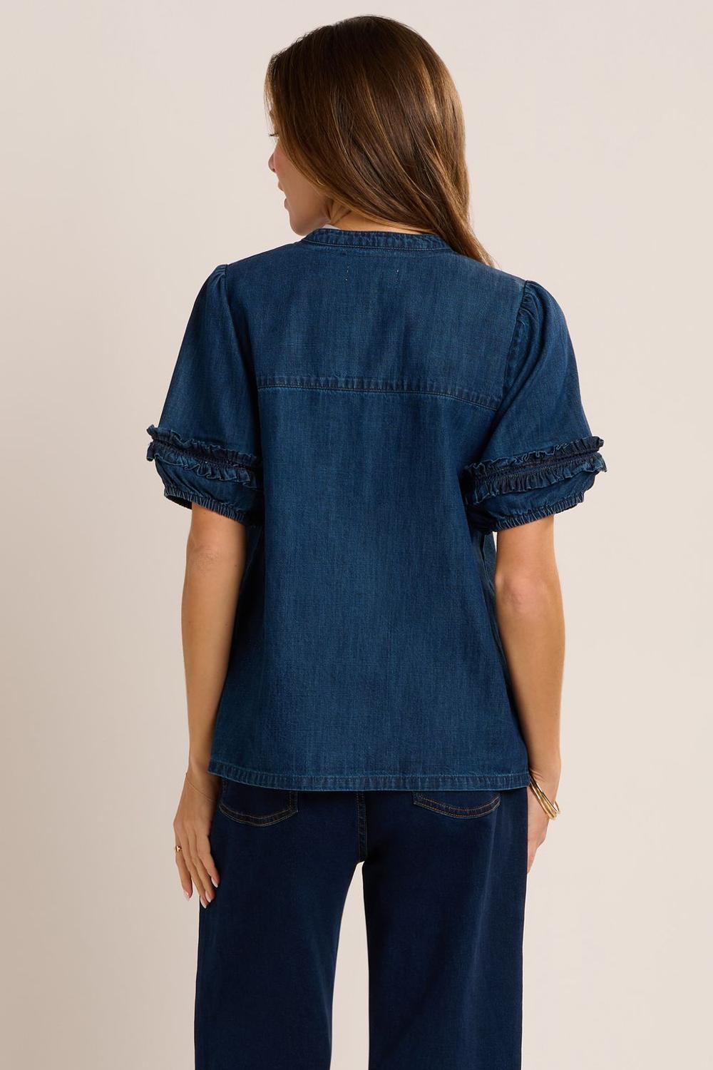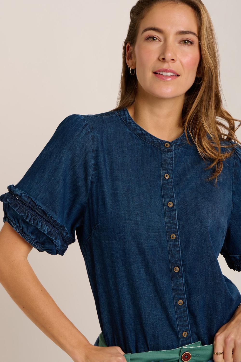 Berna Blouse made from 100% cotton denim is a versatile addition to your wardrobe. The sleeves feature an on trend puffed shape with ruffles and ladder lace details. It features a crew neck with wooden button placket fastening and a straight body fit. Perfect for styling up your everyday wardrobe.