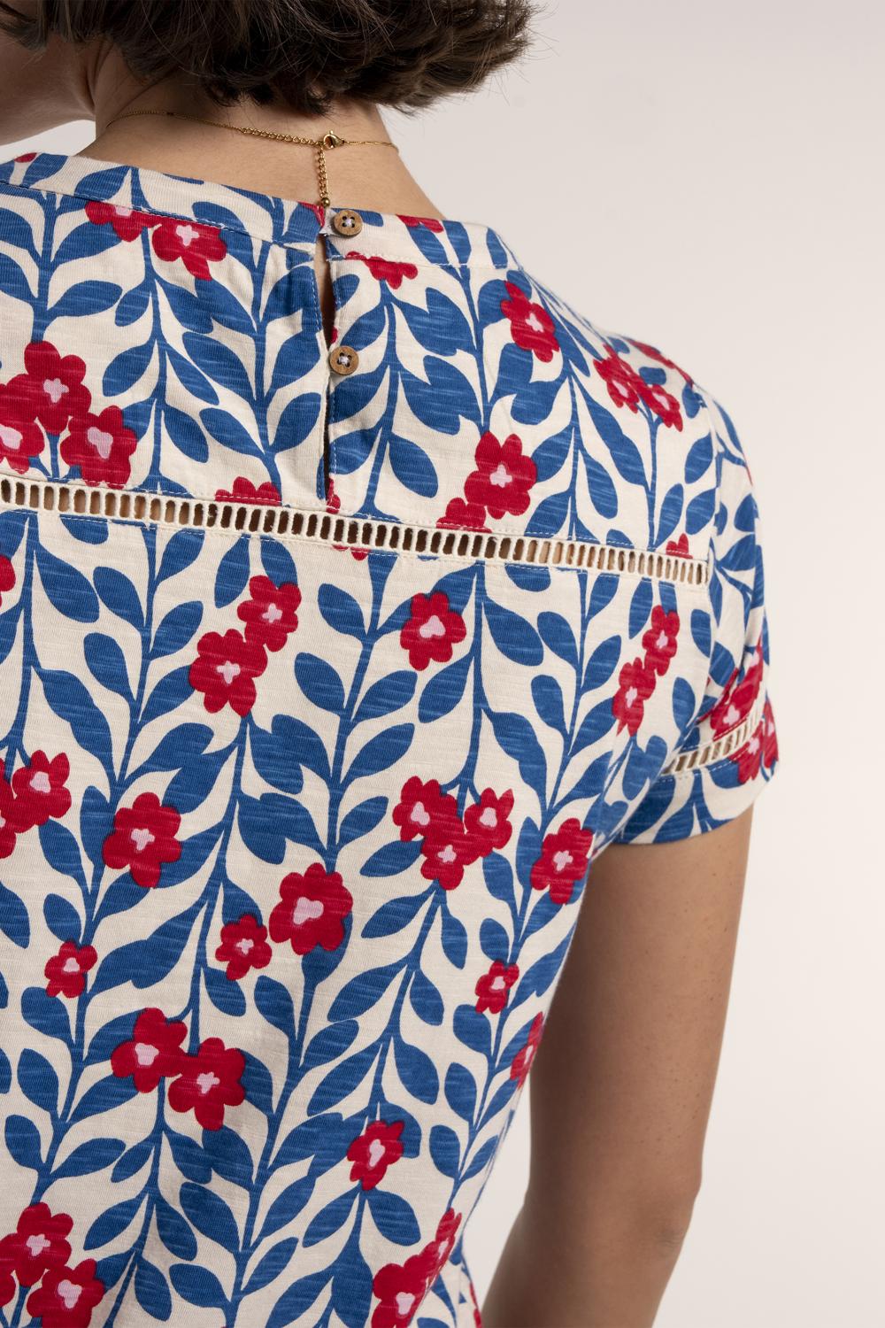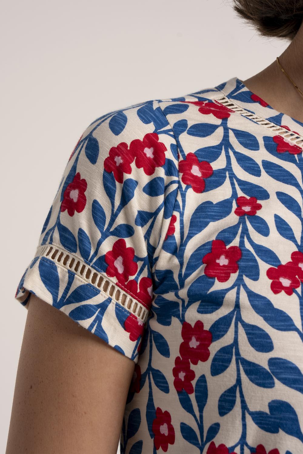 T-shirt weather? Our Clara T-Shirt brings a pop of colour to your everyday wardrobe. Made from textured slub cotton, it features our pretty Trailing print, a soft scoop neckline with ladder lace detail is echoed at the sleeves, while a ladder lace insert at the back leads to a keyhole neckline with wooden button fastening. A great way to add something a little different to your wardrobe.