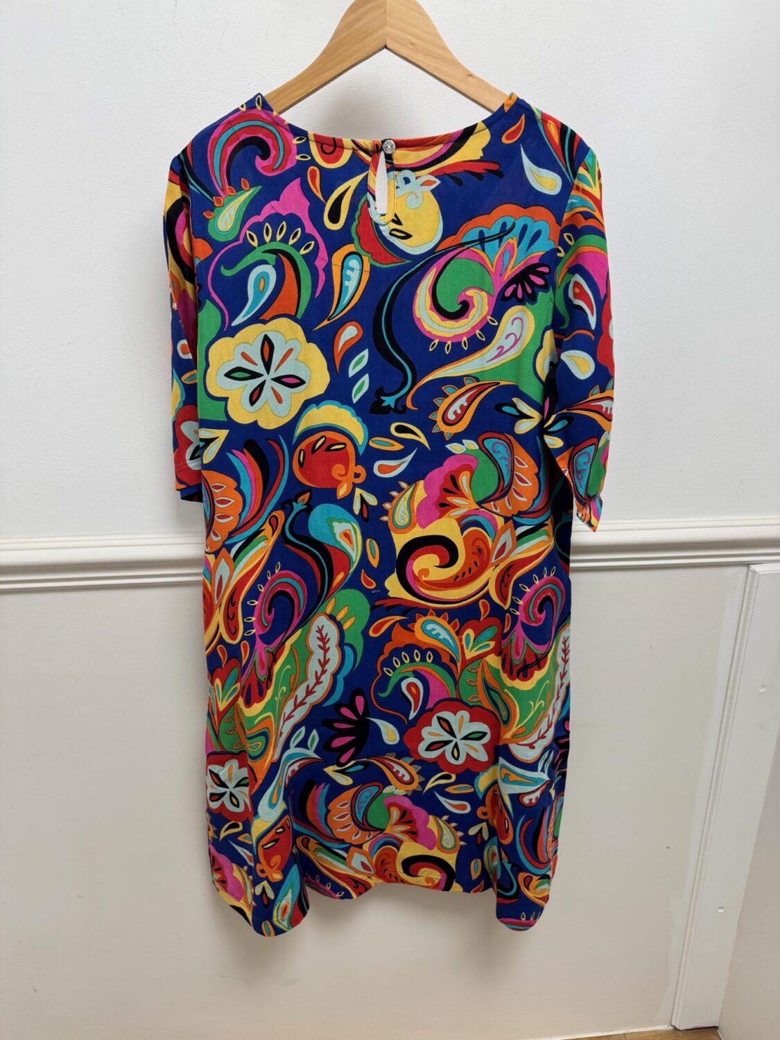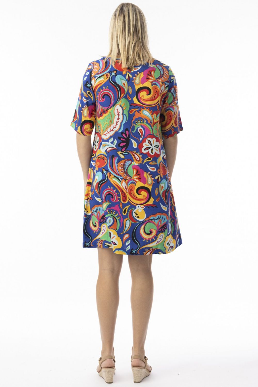 Add a splash of colour to your summer look with our eye-catching contemporary dress. Featuring a colourful, eye-catching pattern, this dress boasts a relaxed fit with half sleeves and a flattering knee-length hem. Made from lightweight, breathable fabric, it’s perfect for warm weather. The round neckline and convenient side pockets add functional elegance, making it ideal for both casual outings and beach holidays.