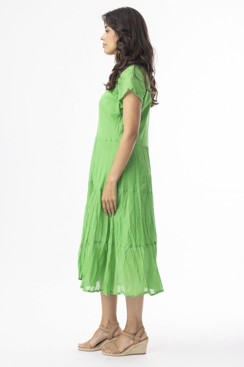 Round neck bias cut dress with short sleeves, also two front pockets hidden in a seam.