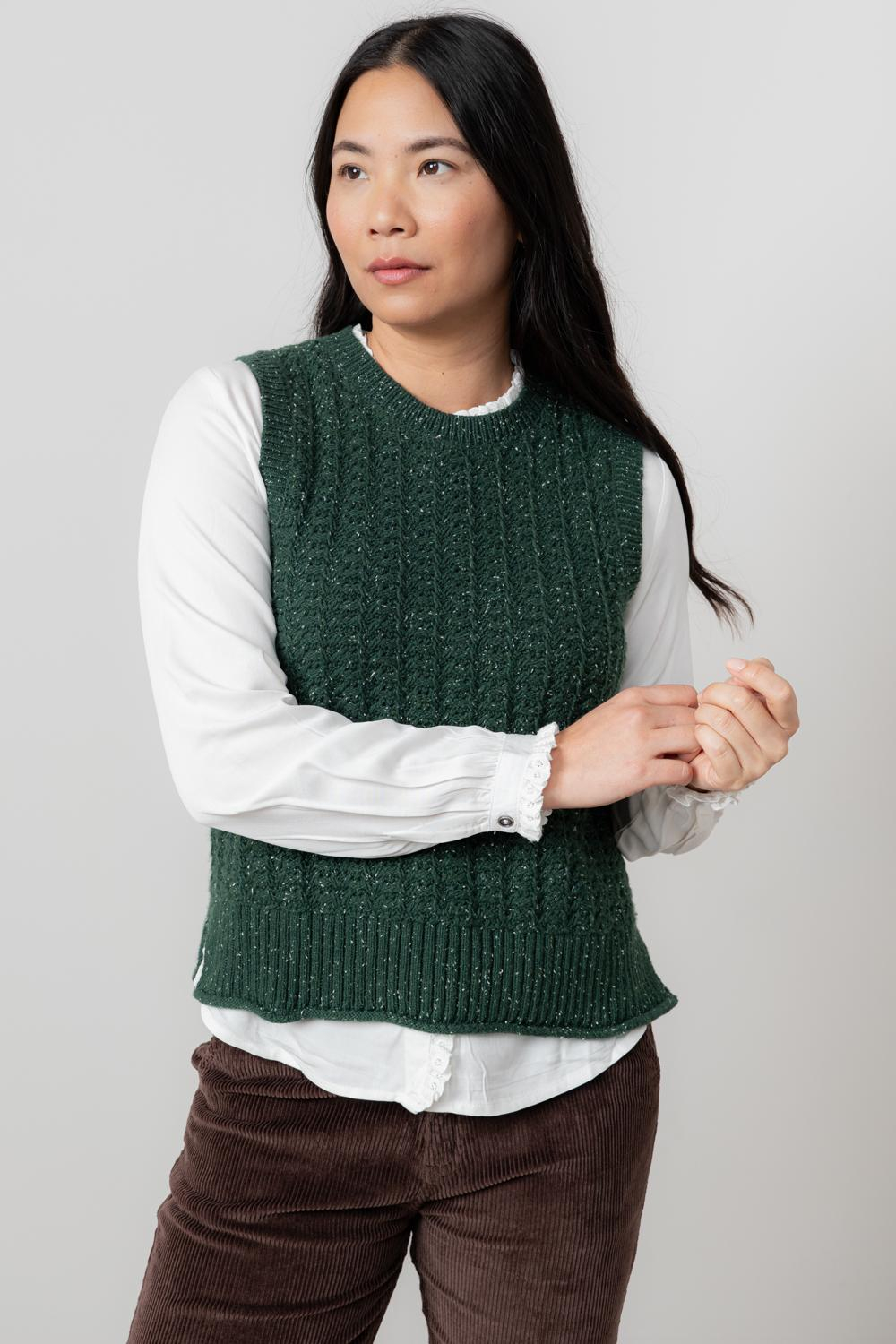 The Eva is a cotton-rich knitted tank in a woven flecked ‘neppy’ yarn giving it a beautifully soft level of colour.