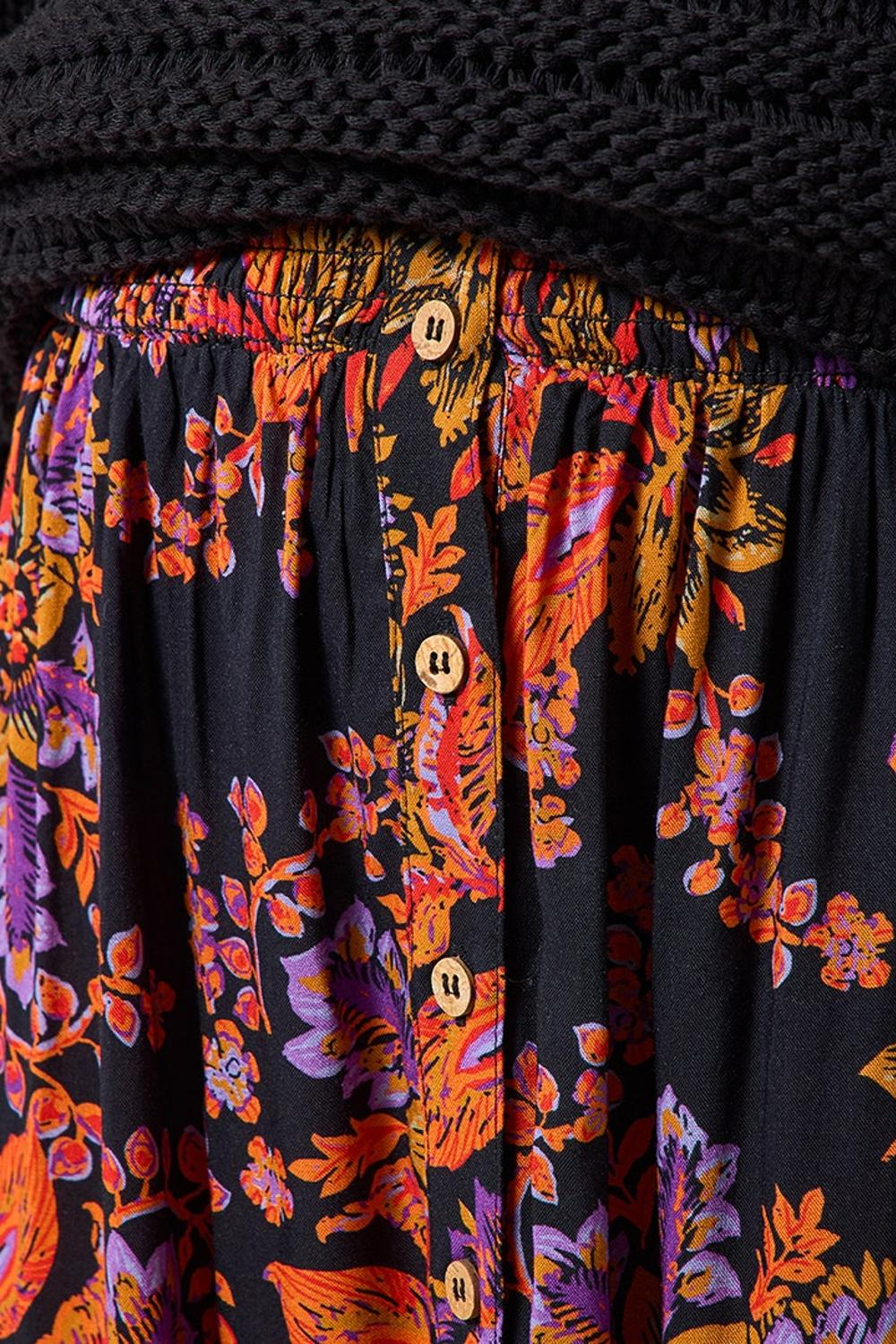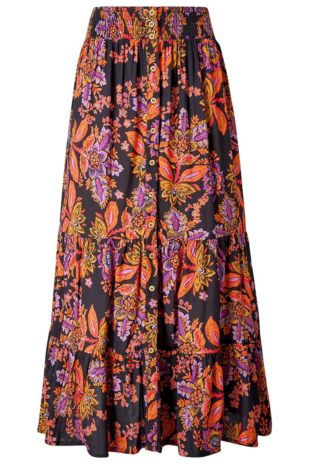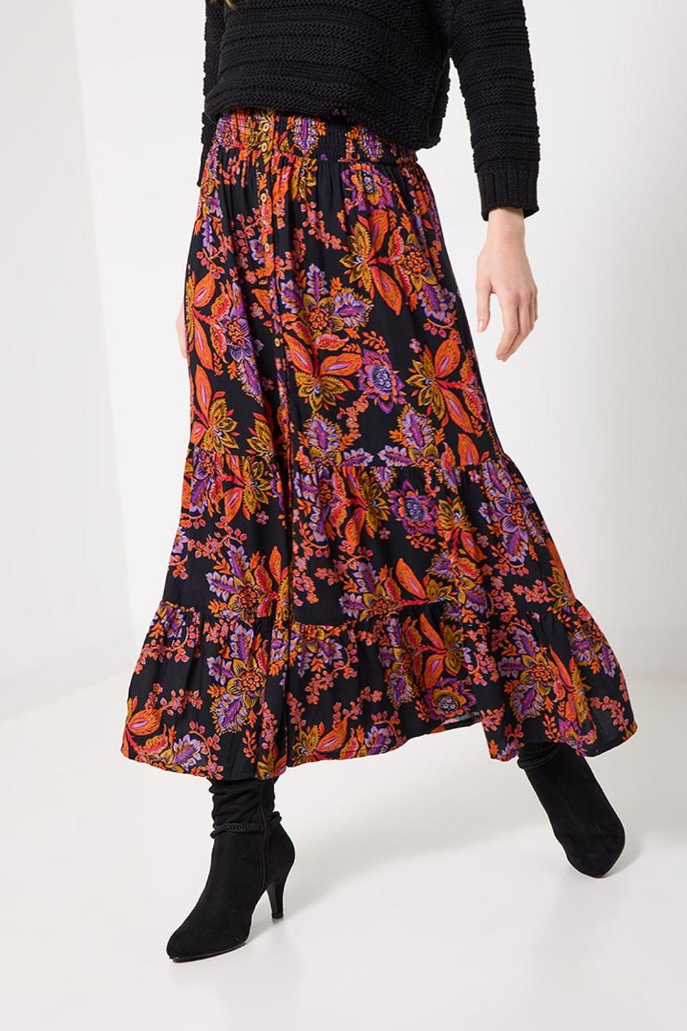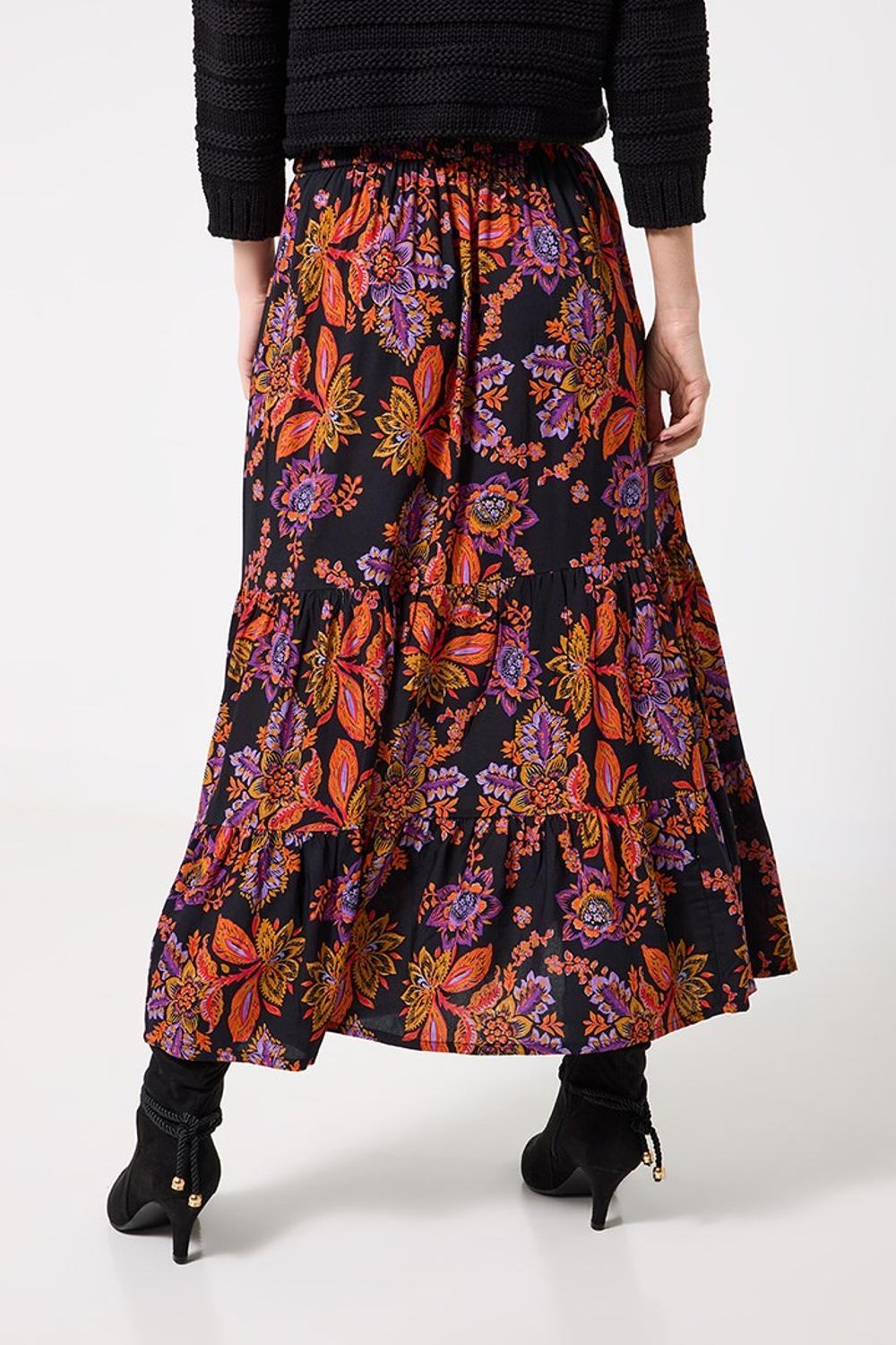 This floral tiered maxi skirt has all the shades of an autumn sunset. Bringing an uplifting splash of colour to any outfit, it’s a piece you can always turn to for seasonal boho styling. Finished in a flowy silhouette that’ll sit beautifully on your figure, it’ll flatter even further when styled with boots or heels.