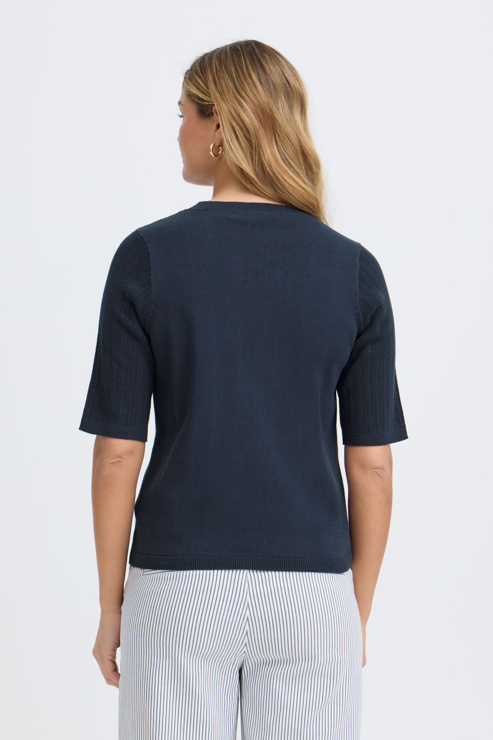 This pretty delicate pointelle knit short sleeve jumper is a great addition to your wardrobe, wear with some jeans and sandals or trainers for a casual look.
