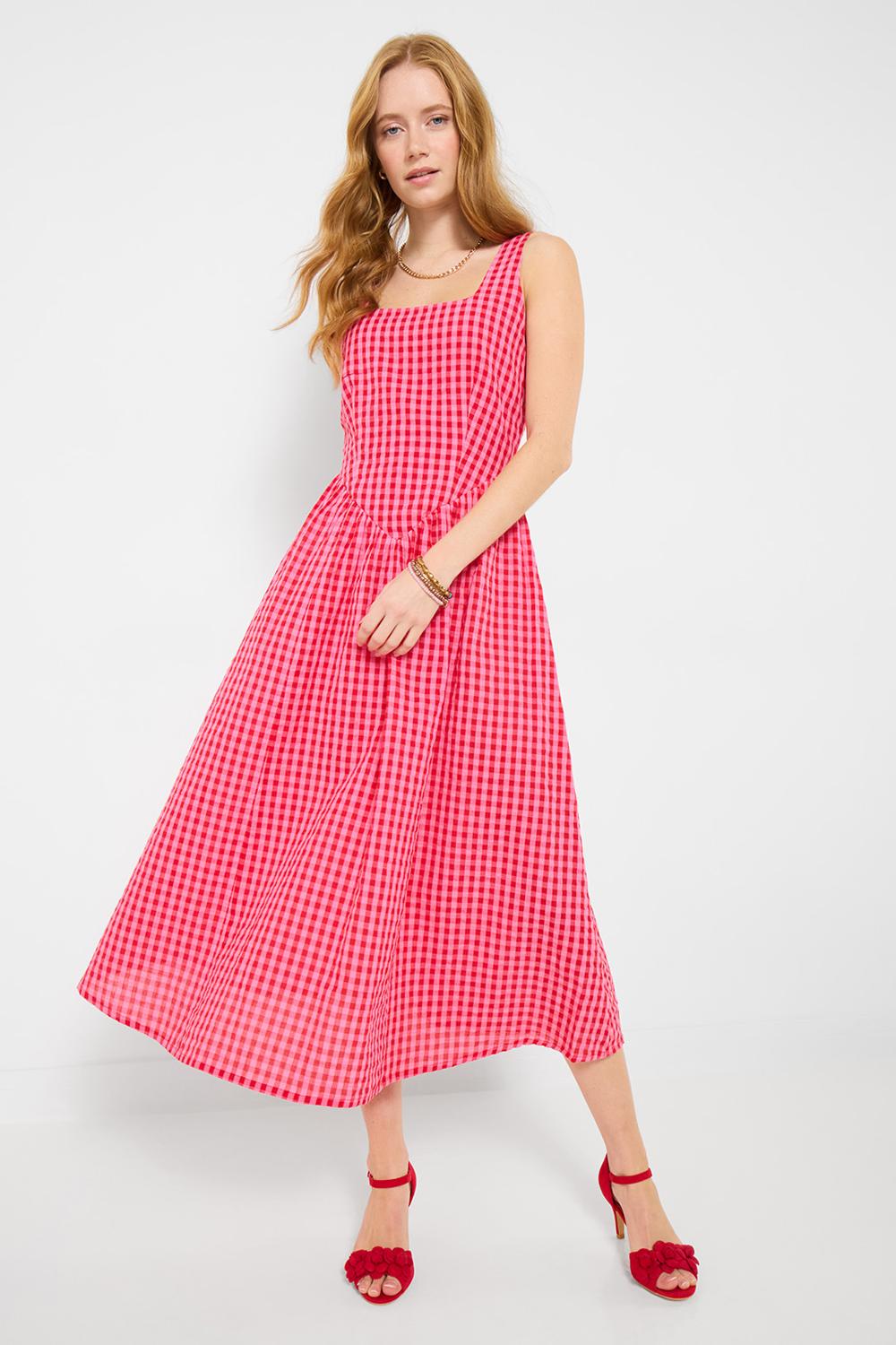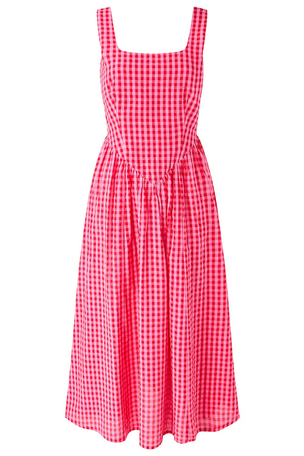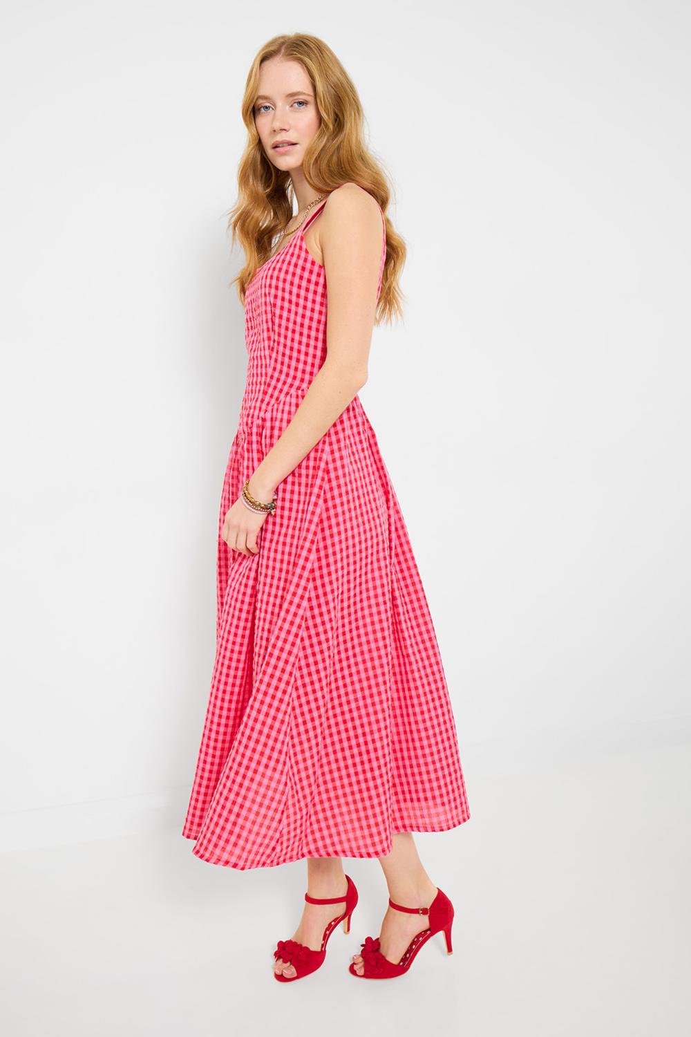 This gingham summer dress is one we love, and it’s perfect for picnics, BBQs and sunny beach trips. Hitting those vintage vibes with a timeless design, we added texture with seersucker cotton and made it extra chic with a palette of pink and red. Play on its authentic feel with kitten heels and a bold lip, or add a modern touch with wedges and a straw hat.