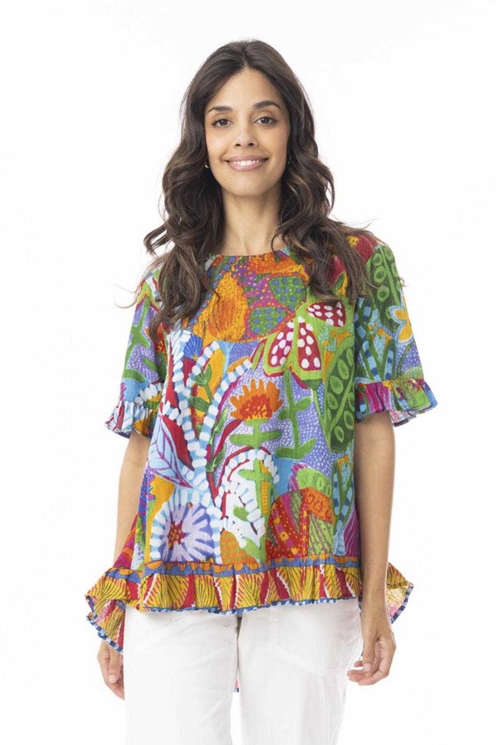 Colourful swing top with a round neck and frill at the hem and sleeves, wear with a plain pair of trousers or skirt for a elegant look.