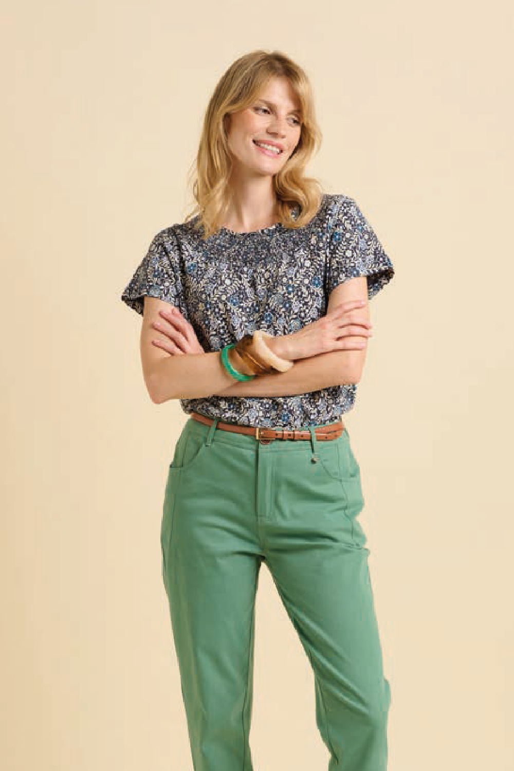 Shirred neckline t-shirt in 100% cotton, relaxed body fit, in a flower design in lovely shades of Blue, wear with jeans or casual trousers for a smart casual look.