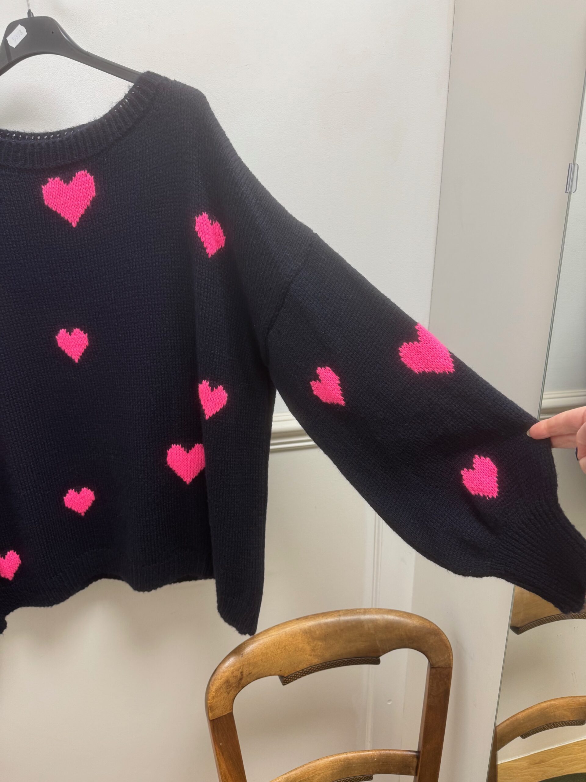 Cosy Navy knit with coloured hearts, great to wear with jeans and trainers for a casual look.