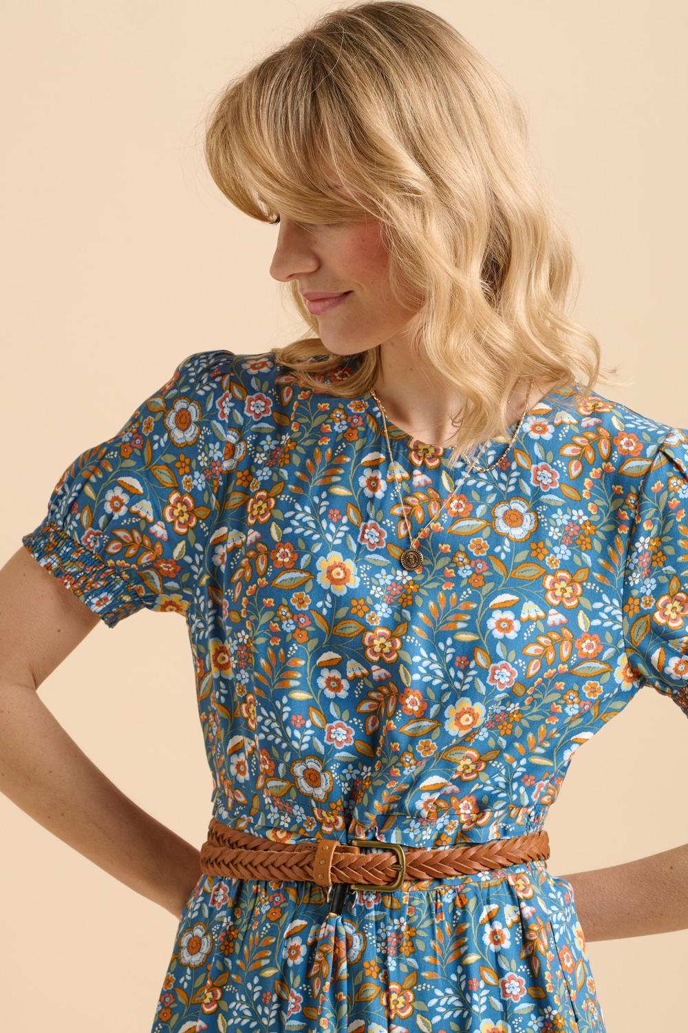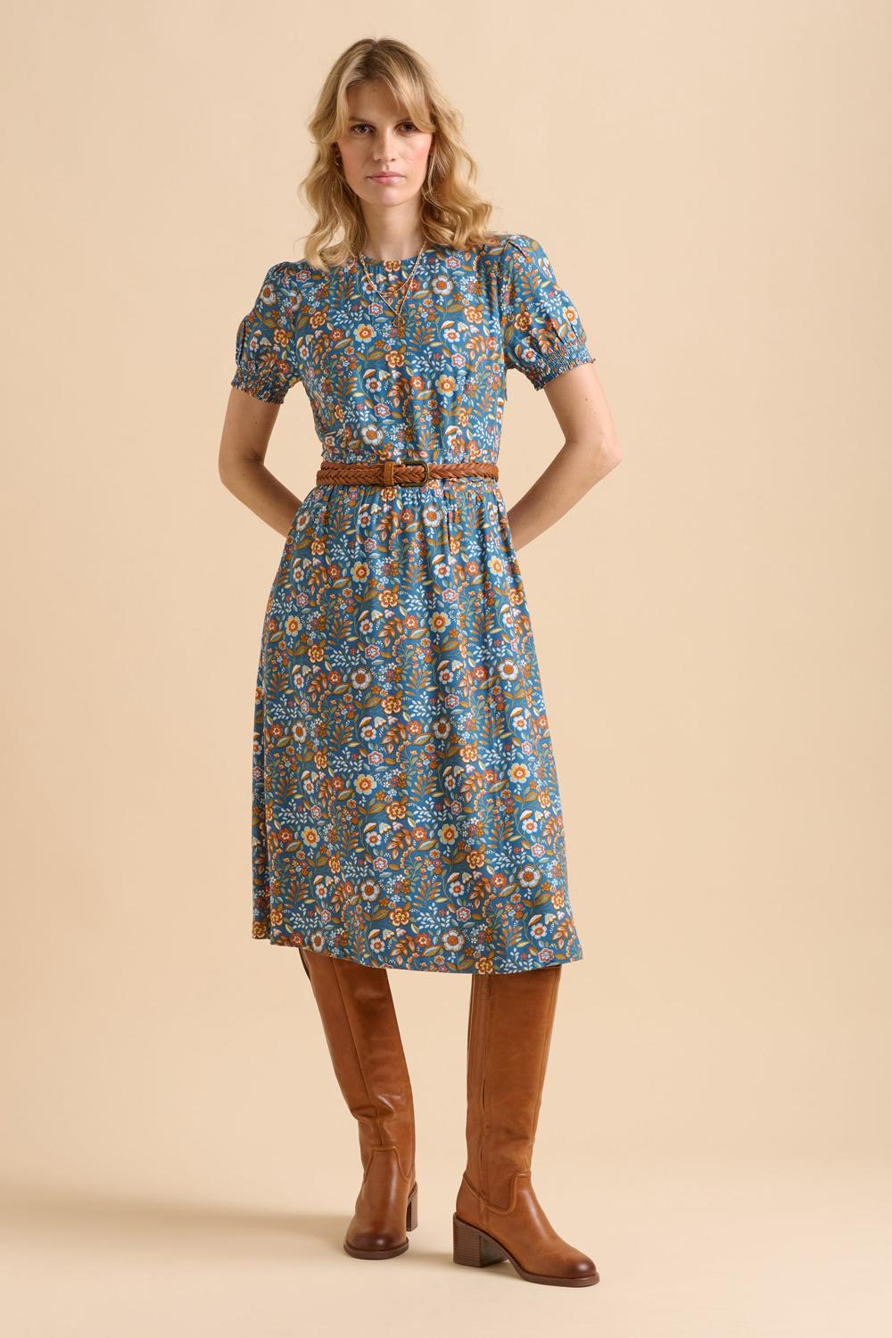 The dress is all about flattering your figure. With pleats at the waist, darts, and an elasticated back, it hugs in all the right places. The rich, warm floral fabric and puffed sleeves with shirred cuffs complete the look, making it perfect for dressing up with heels.