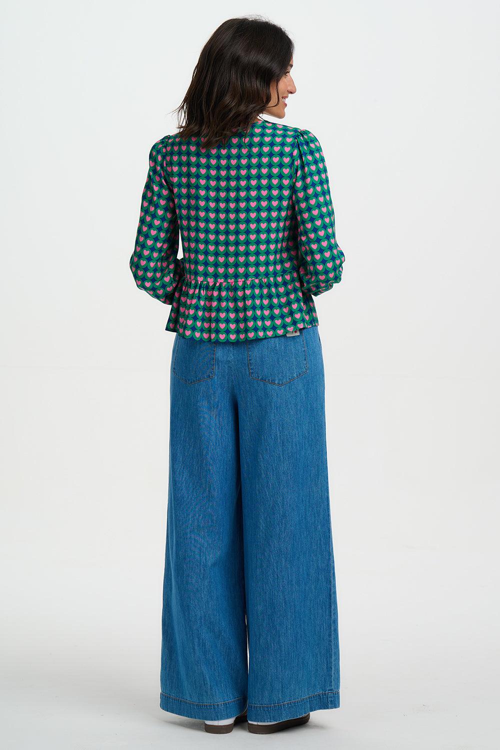 The Olina Top is a playful, easy-to-wear style with a relaxed silhouette and feminine details. Featuring a soft tie neckline, gentle gathers at the waist and blouson sleeves with elasticated cuffs, it’s finished in a bold retro heart print. Perfect for pairing with jeans or tailoring for effortless everyday charm.