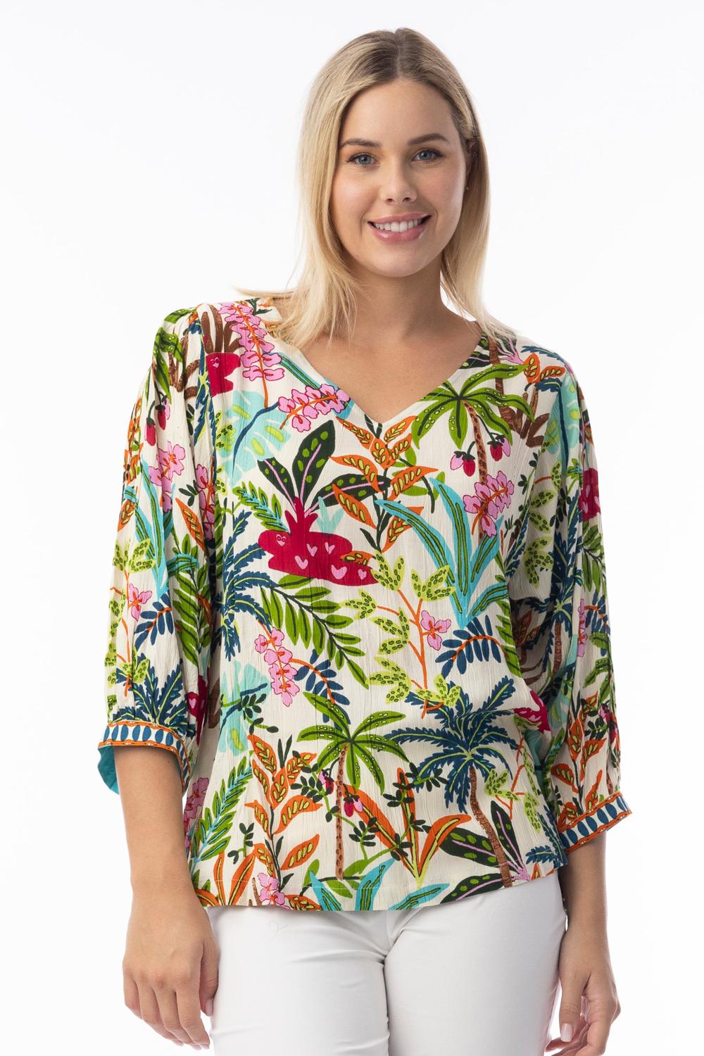 V neck loose fitting top with 3/4 cuffed sleeves, a typical boho feel to this blouse, would look great with jeans and boots