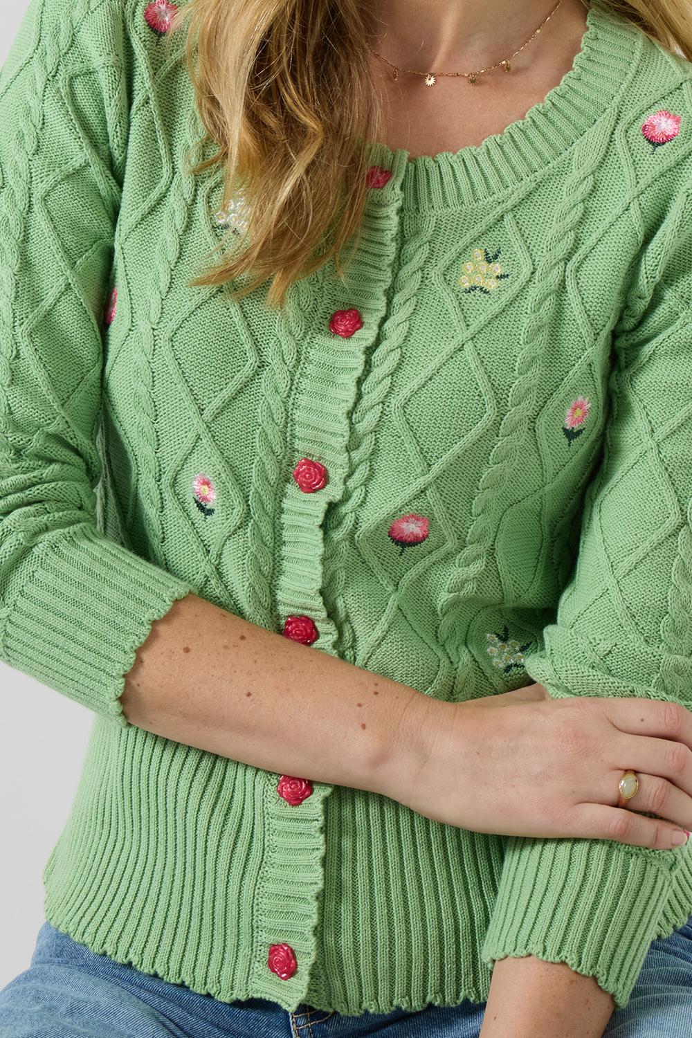This women’s cardigan is all about pretty spring florals, from the embroidery to the buttons. Blooming off a green cable-knit base, we even added scalloped edges to really bring it to life. The cutest style you’ll wear all season, it’ll instantly take top spot in your wardrobe.