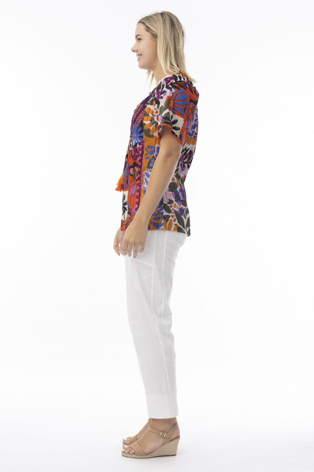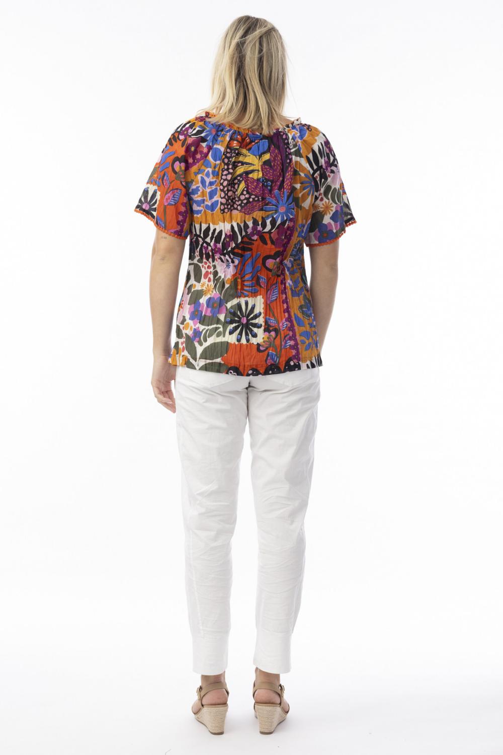 Elasticated neckline with tie & tassels, that can be worn off the shoulder, short sleeves with embroidered edging.
