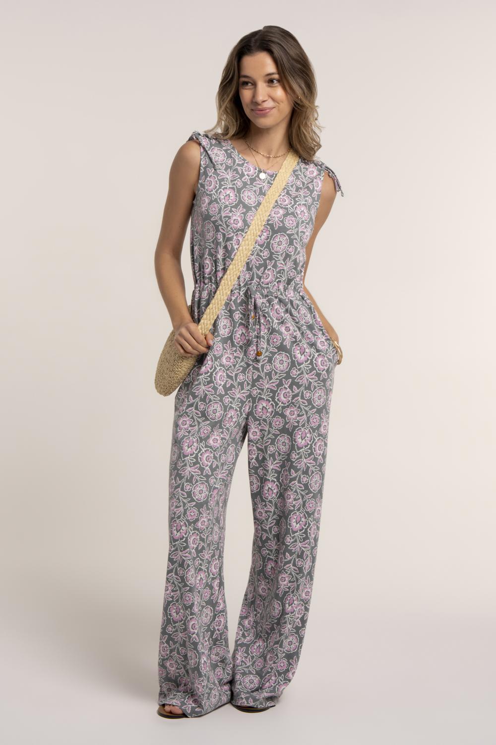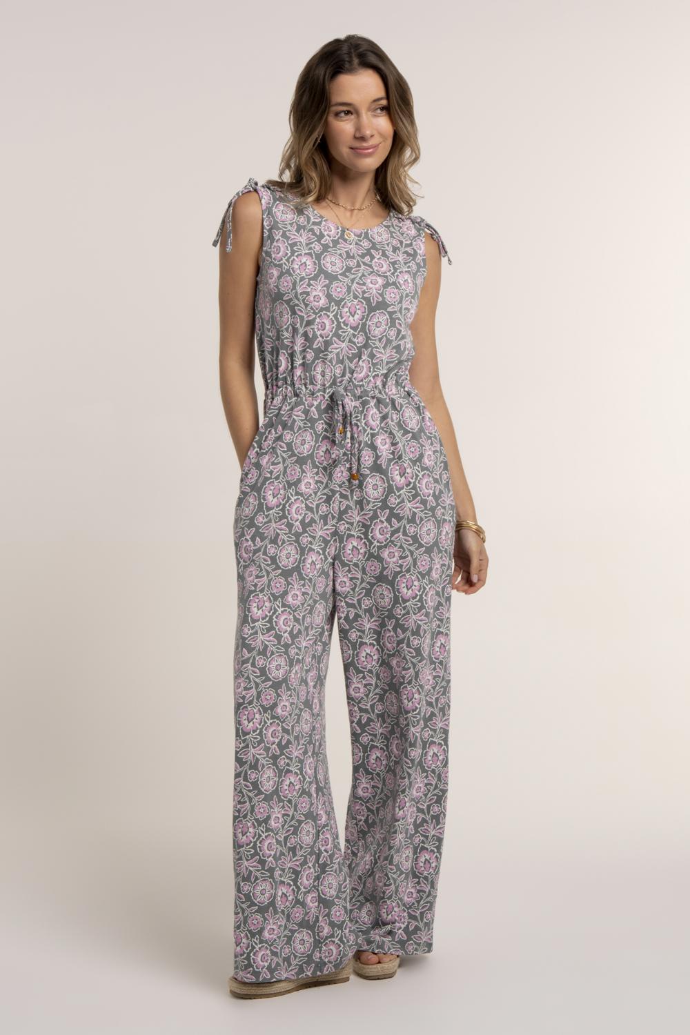 Our Sari jumpsuit with our spring meadows print, designed in mid-weight slub jersey. The V-neckline, smocked ruffle sleeves and elasticated waist create a flattering shape, with a removable skinny belt for added definition. Style with sandals for an easy daytime look.