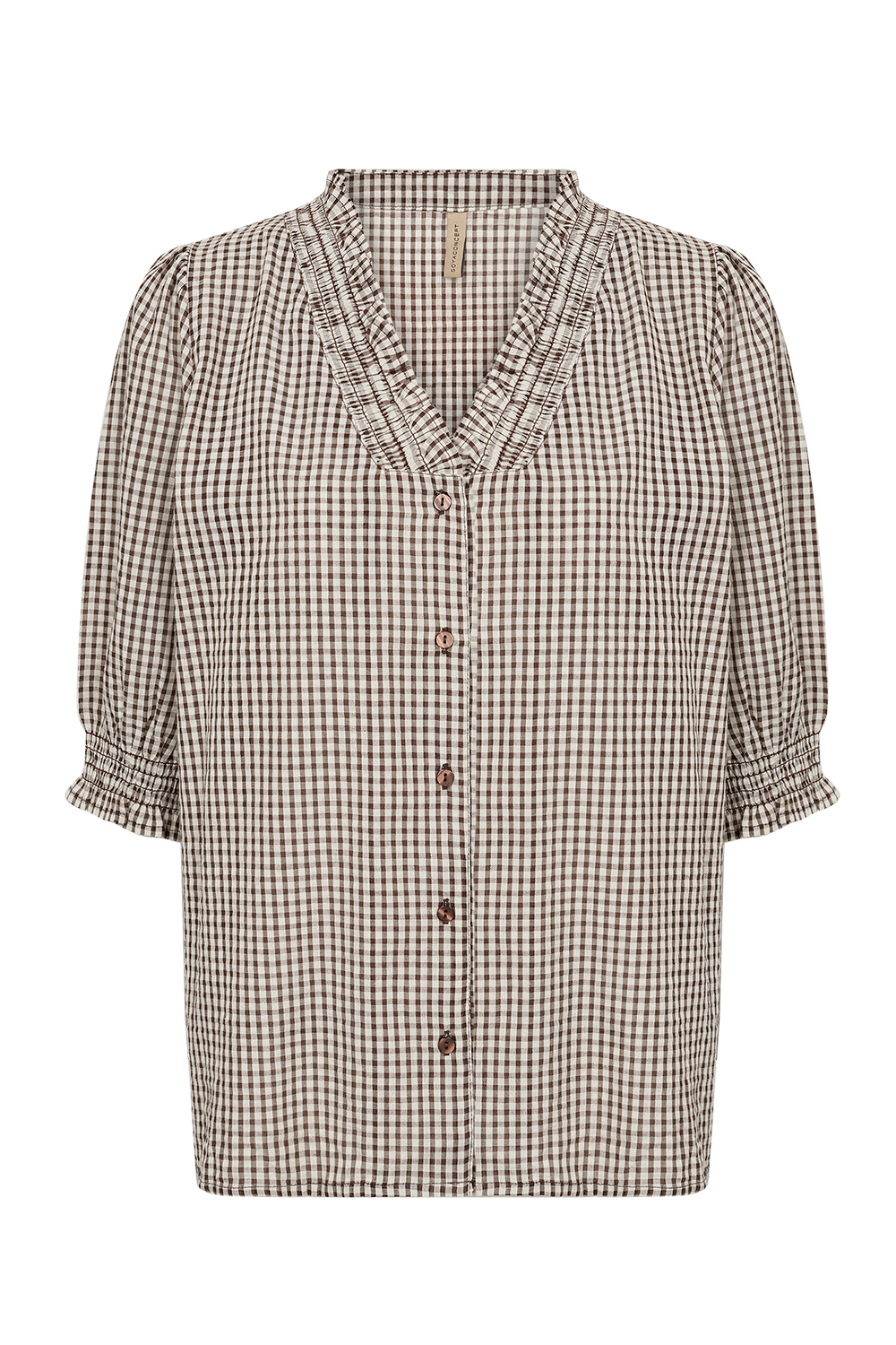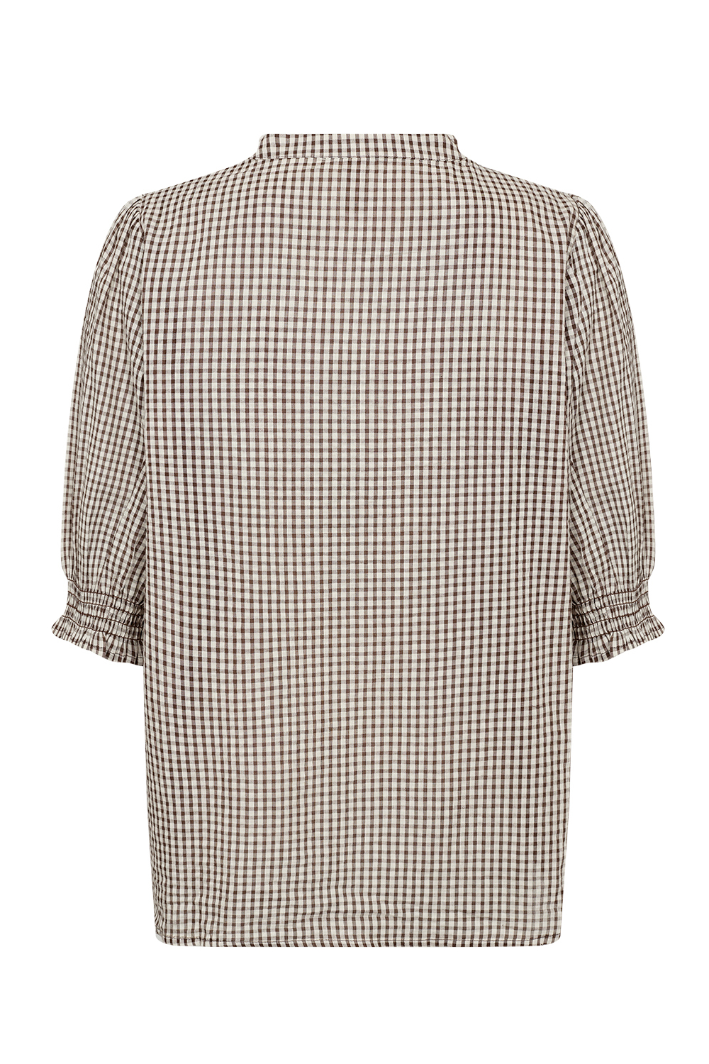 Blouse made from 100% Organic cotton. It has a stylish ruffled collar, button-up front, and elegant checkered pattern. Pair it with tailored trousers or casual denim for a unique look.