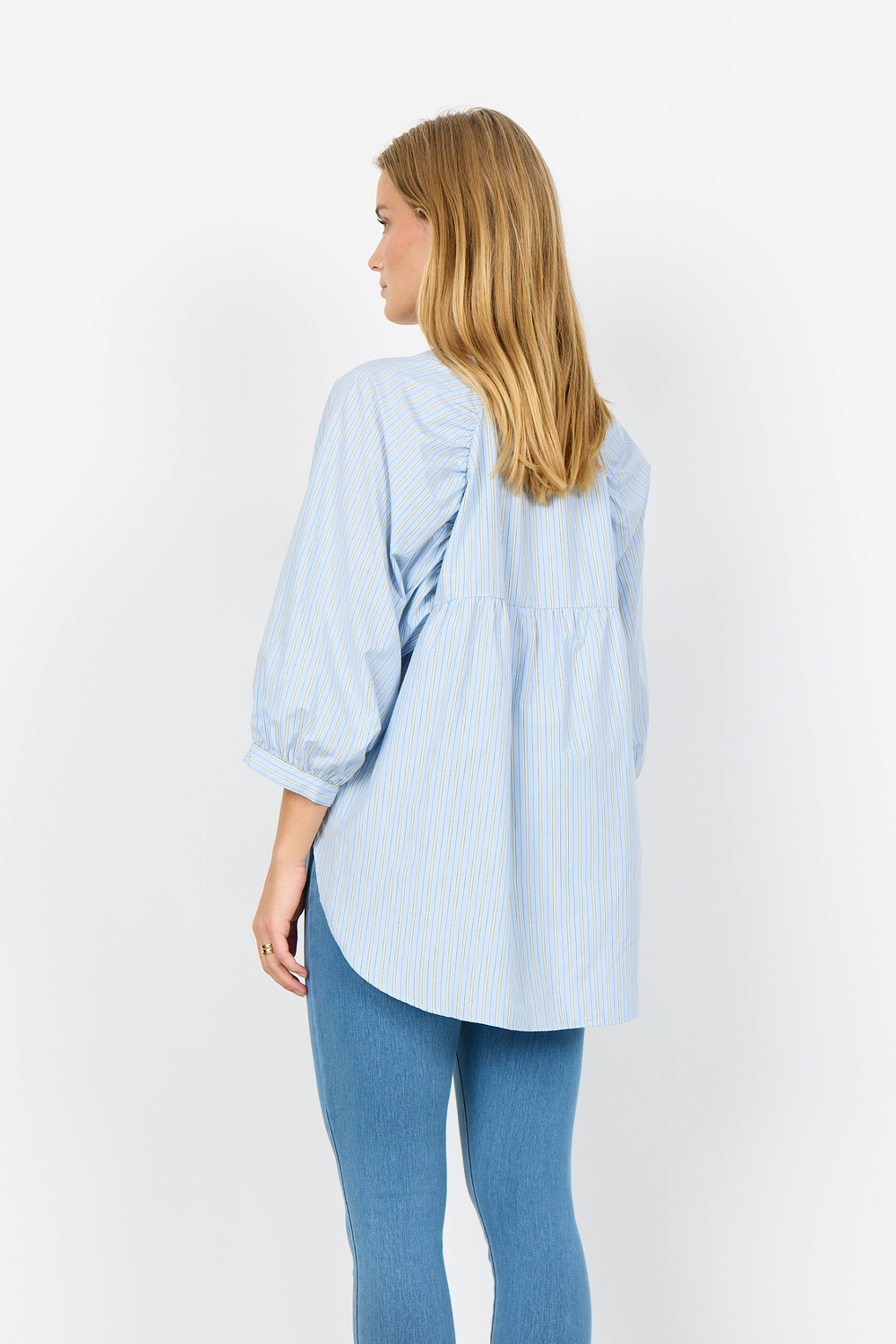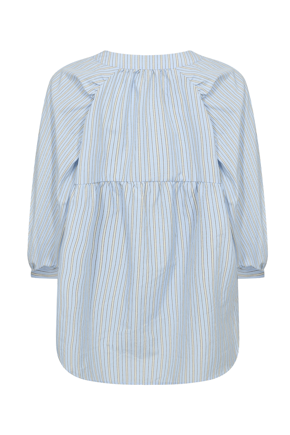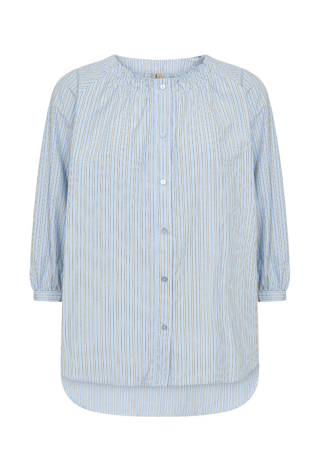 Blouse made from 53% Recycled Polyester and 47% Organic Cotton. This elegant blouse features a round neckline, button-down front, 3/4 length sleeves, and a subtle striped print. Pair it with tailored trousers or jeans for a cool and unique look.