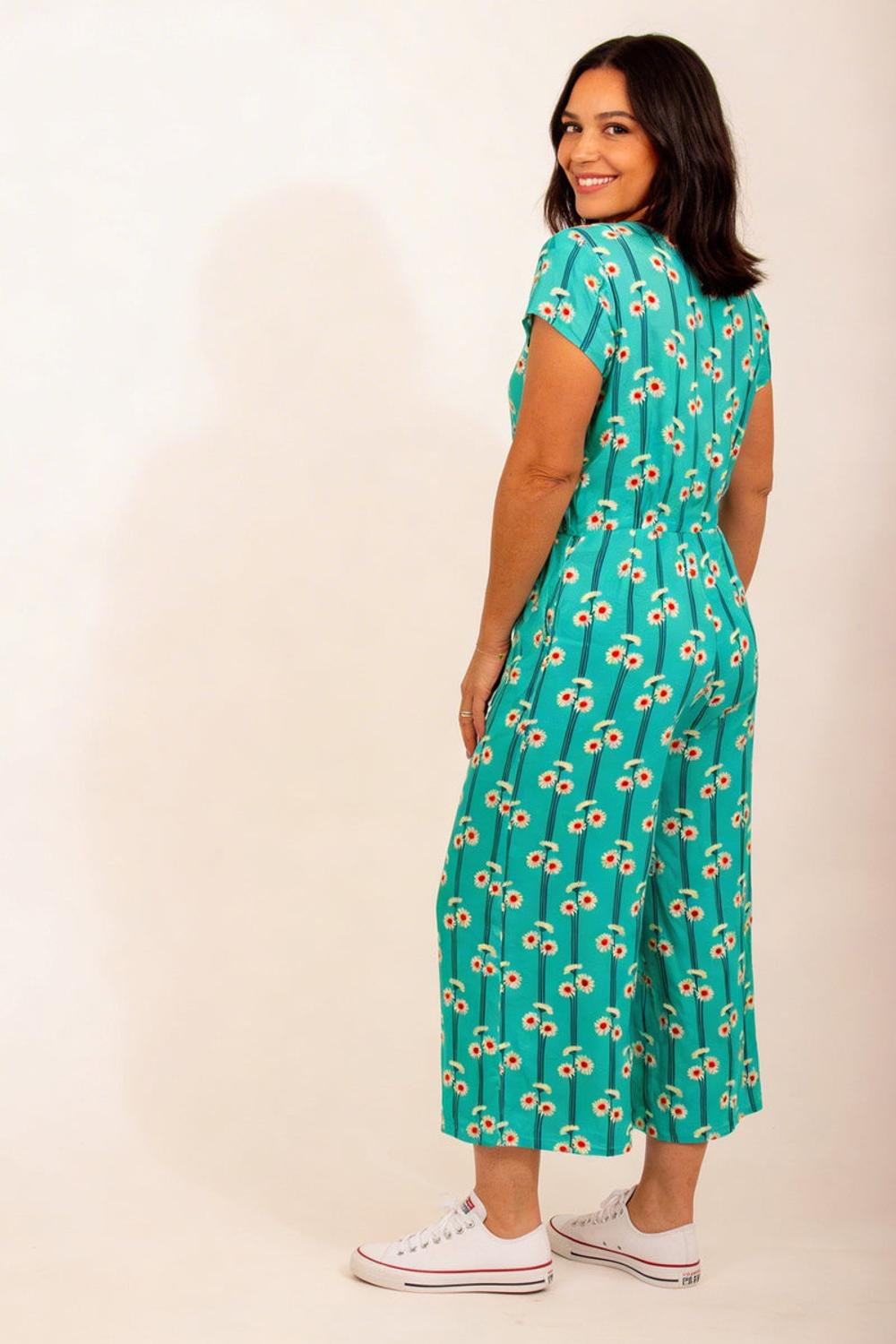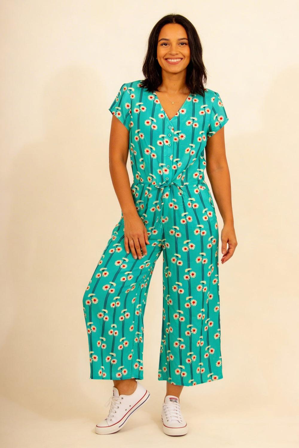 Short sleeves button front and tie waist play suit with the beautiful Gerbera flower throughout.
