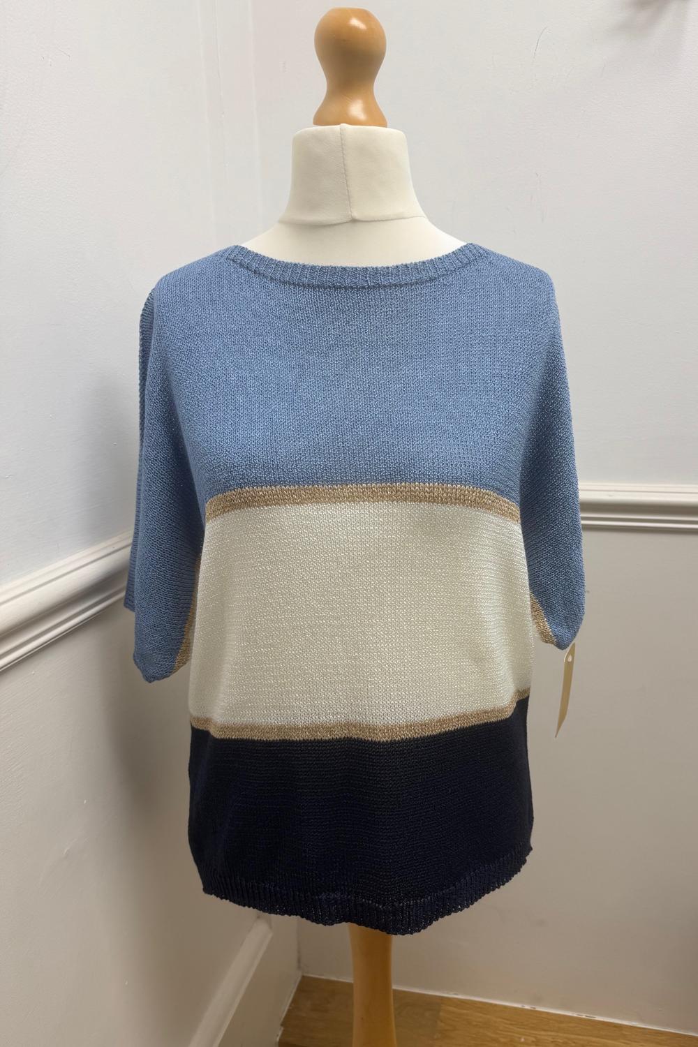 Fine knit jumper with 3 bands of colour, Navy, Cream & Denim Blue, & two smaller bands of gold metallic thread.