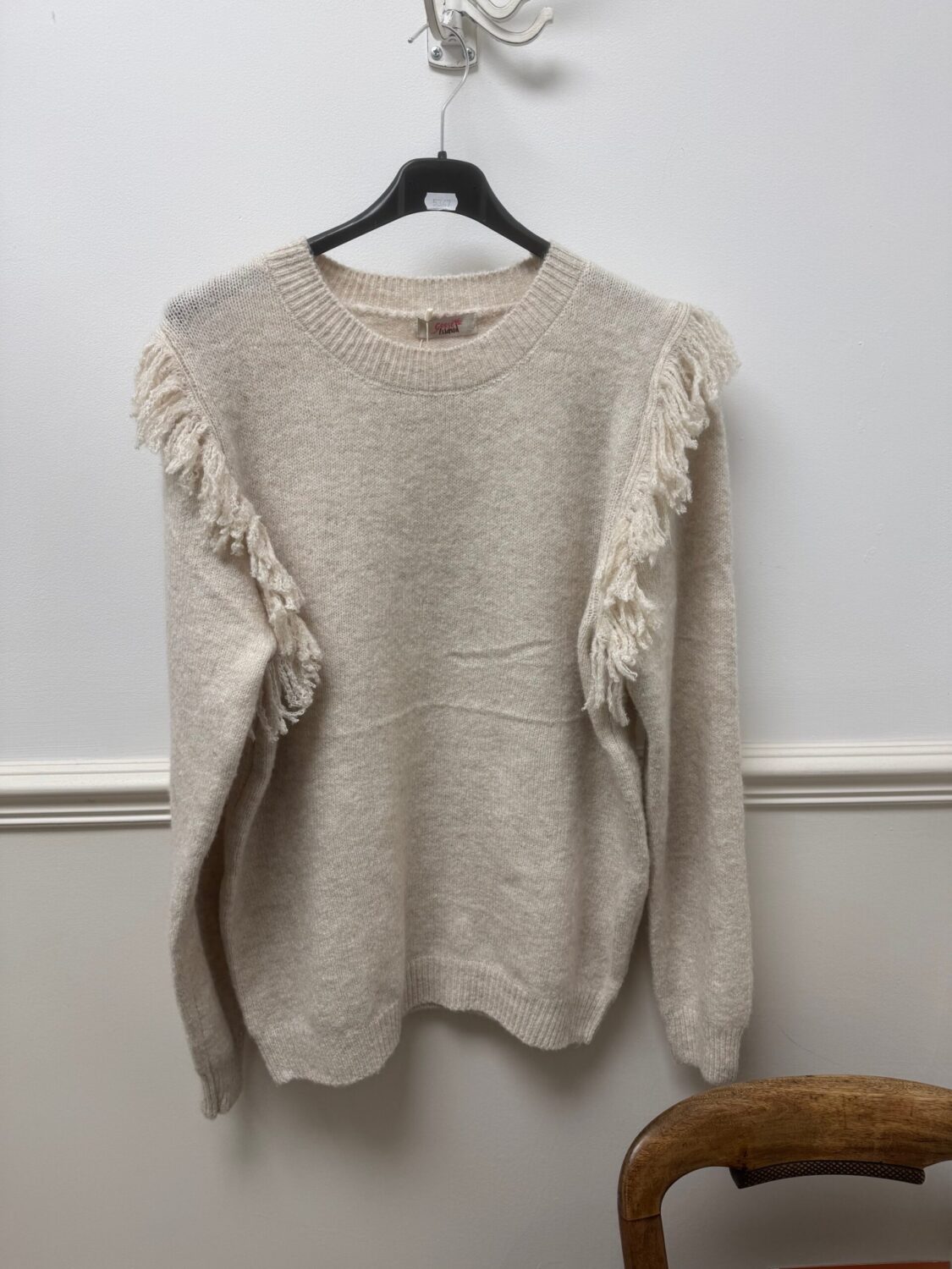 Crew neck woolly jumper with fringe detailing on the shoulders, wear with jeans or skirt for a casual but smart look.