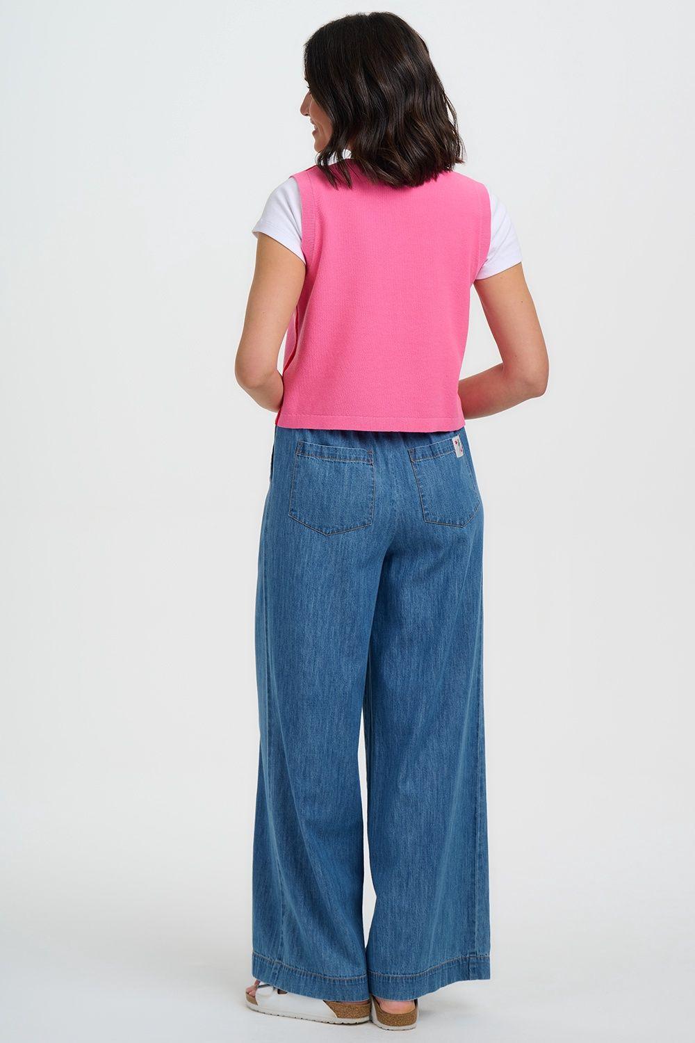 The Zina Knit Vest in soft pink with contrasting red tie fastening. This short-length knit vest combines playful colour blocking with a secure tie closure, perfect for layering over basics/White Blouse or wearing as a standalone piece. Crafted from quality knit fabric, it delivers both comfort and contemporary style for everyday wear.